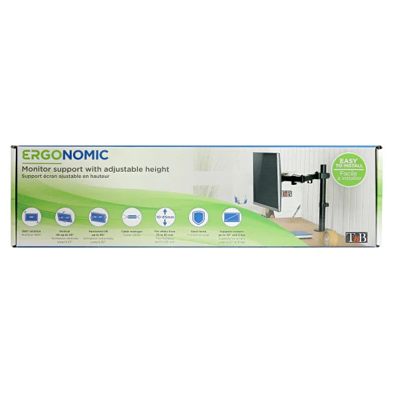Screen pole with simple articulation and adjustable height. Its steel finish assures its solidity and its reliability in time. The articulation of the arm and the head, combined with its 360° rotation around the pole allow you to find the ideal position for your monitor. The cable management clips allow you to organize and clear your office. Ultra simple installation thanks to its clamping screw compatible with desk between 10 and 85 mm of thickness. Handles screen weight until 8 kgs. Articulated arm : +/-90°. Tilt angle : +/-45°.