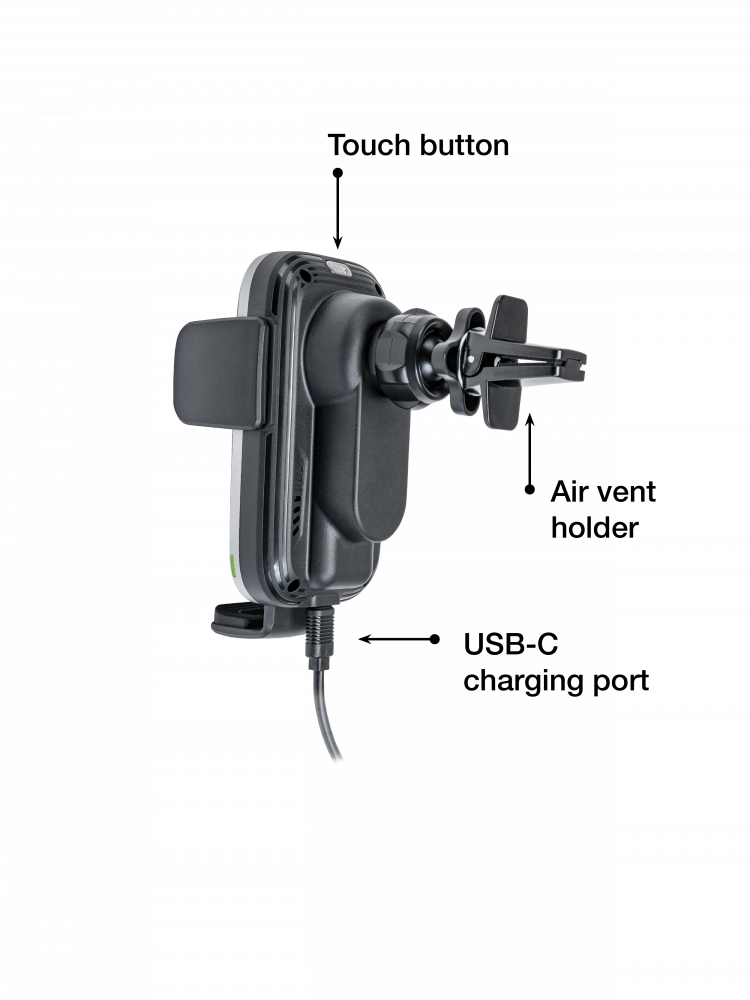 - Three mounting options: vent holder, suction cup on dashboard, or front window